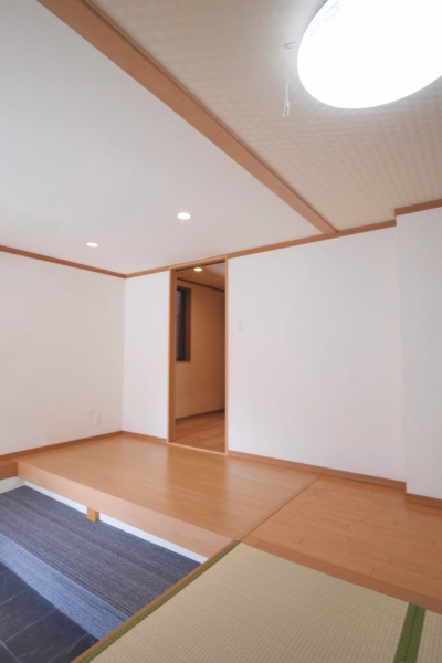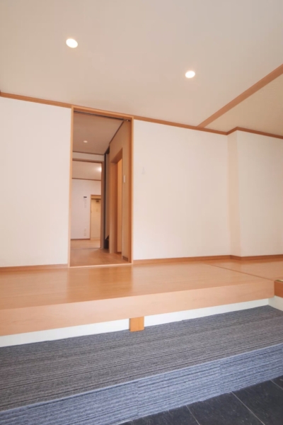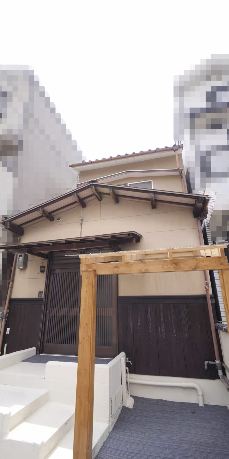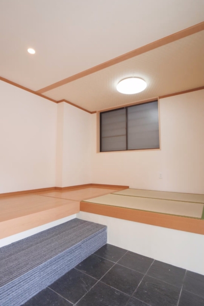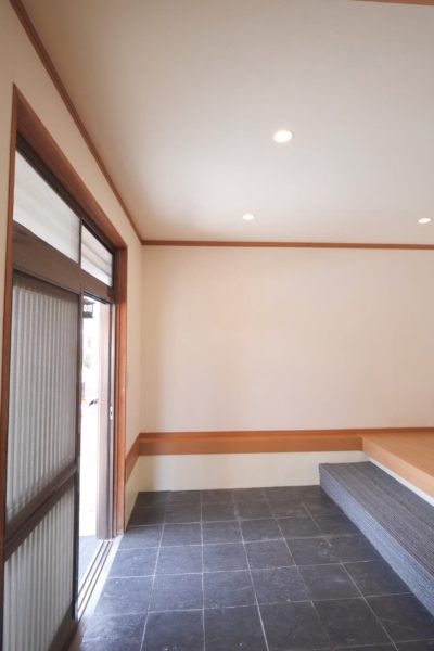 【内覧予約受付中】 ぜひ一度、現地で魅力を感じてくださいね!💫 🏡和モダンにリフォームされた玄関がおしゃれ✨土間の黒タイルと畳のコントラストが素敵です。玄関横には木製支柱を使った屋根付き駐輪スペースがあり、外観のアクセントになっています🚲🌳